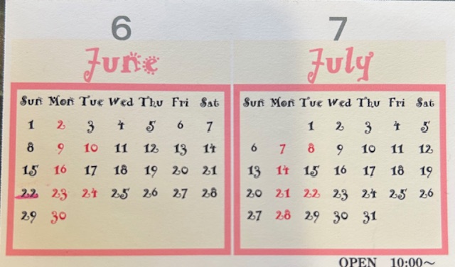 ☆6月・7月のカレンダー☆ 2025年5月27日 最終更新日時 : 2025年5月27日 satomin 6月22日(日)臨時休業とさせていただきます~ The rainy season is about to start....