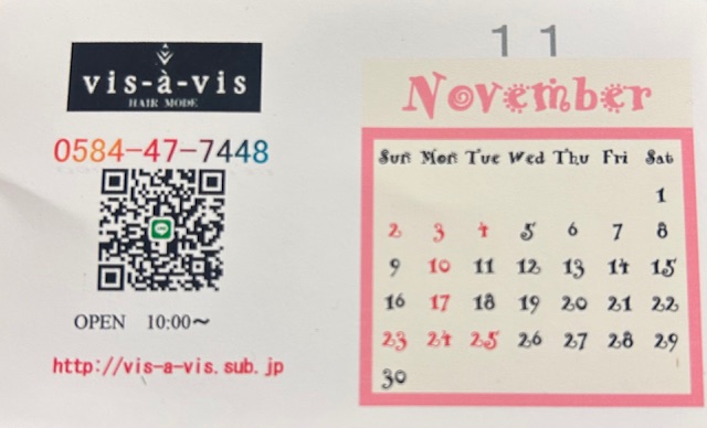 ☆11月のカレンダー☆ 2025年10月25日 最終更新日時 : 2025年10月25日 satomin 3連休いただきますが... 4日、25日は事前予約のみ営業いたします(#^^#) 七五三、結婚式シーズン、セット着付け早めにご予約くださいネ♪